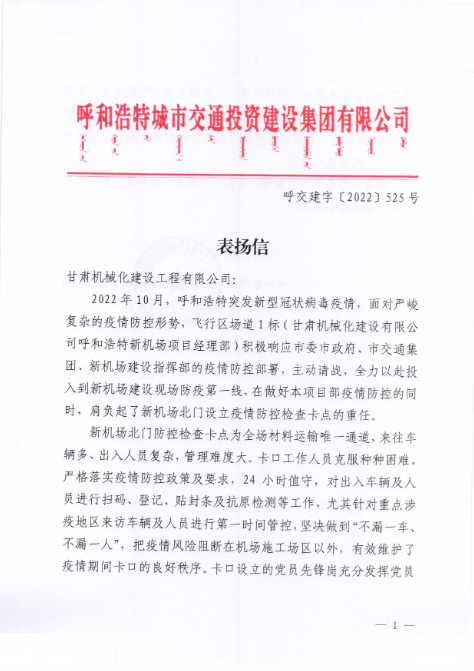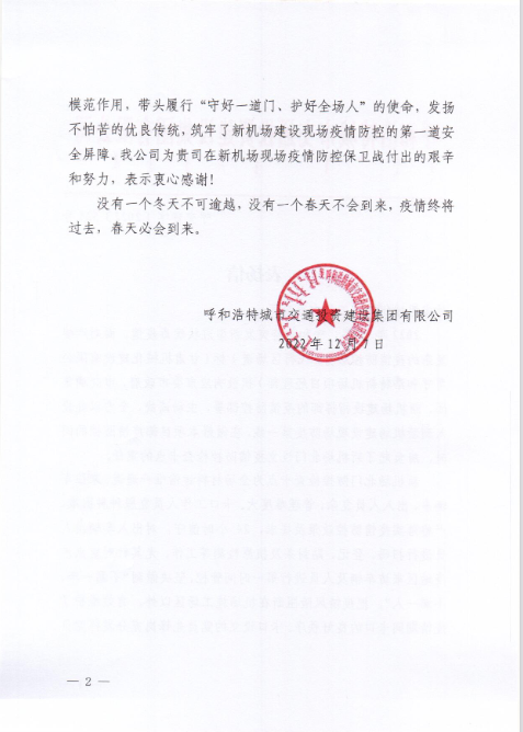 2022年12月7日,呼和浩特市交通投資建設(shè)集團(tuán)有限公司給我司發(fā)來表揚信,表揚信中充分肯定了我司呼和浩特新機場項目部在疫情防控工作上作出的努力,展現(xiàn)了我司的社會責(zé)任與擔(dān)當(dāng)。