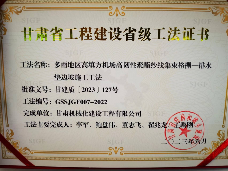 近年來(lái),我司不斷加強(qiáng)技術(shù)創(chuàng)新和精品工程創(chuàng)建,科技創(chuàng)新能力和工藝水平再上新臺(tái)階。在承建的麗水機(jī)場(chǎng)土石方工程02標(biāo)段中,面對(duì)多雨地區(qū)高填方施工中的重難點(diǎn),公司專門(mén)組建了科研和施工小組,通過(guò)大量現(xiàn)場(chǎng)工藝實(shí)踐、工藝改善,提煉出項(xiàng)目重難點(diǎn)的關(guān)鍵技術(shù)。2023年6月,獲得了“多雨地區(qū)高填方機(jī)場(chǎng)高韌性聚酯紗線集束格柵—排水墊邊坡施工工法”。